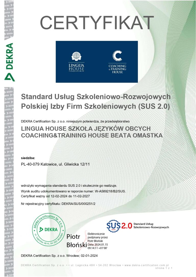 Posiadamy Certyfikat Jakości prowadzonych szkoleń SUS 2.0